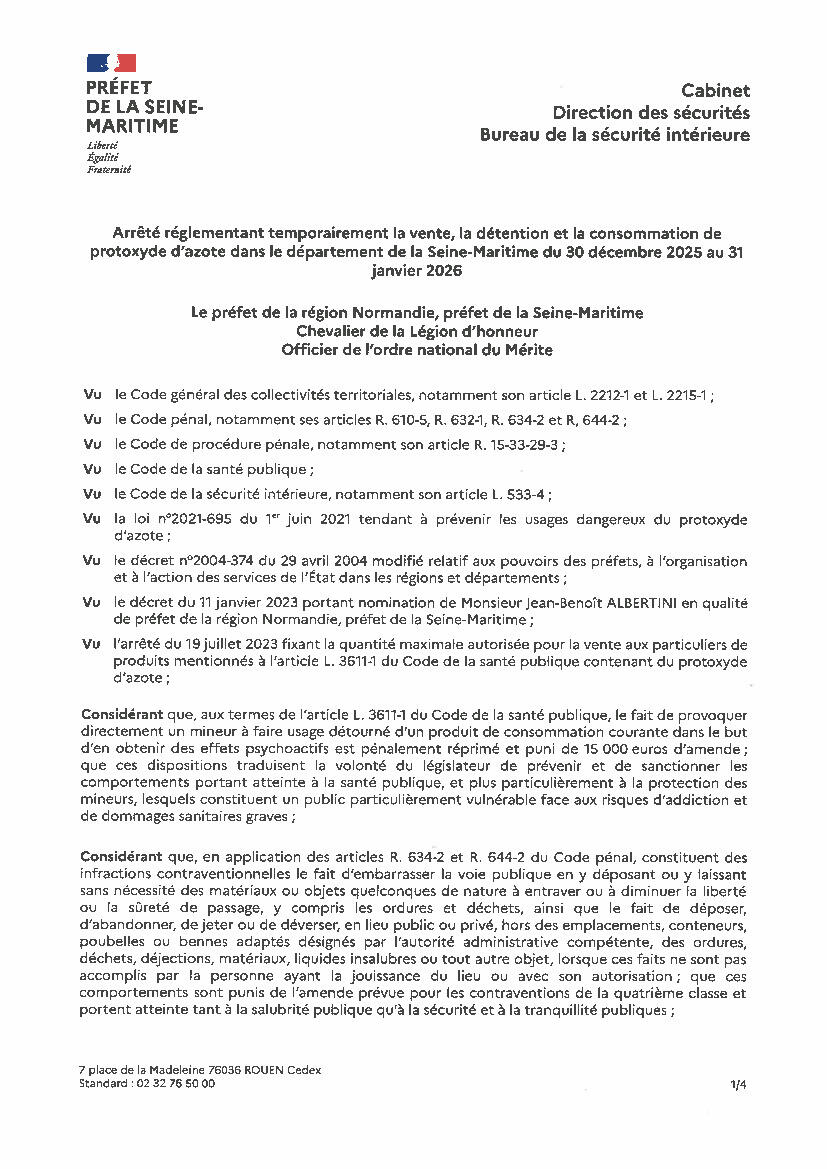 Nous vous prions de bien vouloir trouver en pièce jointe l'arrêté préfectoral en date du 29 décembre 2025 réglementant temporairement la vente, la détention et la consommation de protoxyde d'azote dans le département de la Seine-Maritime du 30 décembre 2025 au 31 janvier 2026.