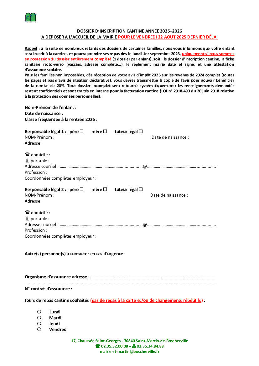 Ainsi, pour permettre l'inscription de vos enfants à la cantine, nous vous invitons à déposer les éléments en pièces jointes à la mairie :