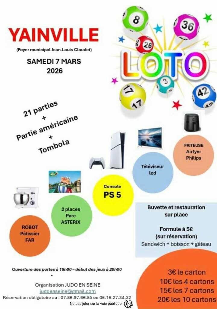 L'association Judo en Seine organise un loto le samedi 7 mars 2026 à 20h00 à Yainville (Foyer municipal).