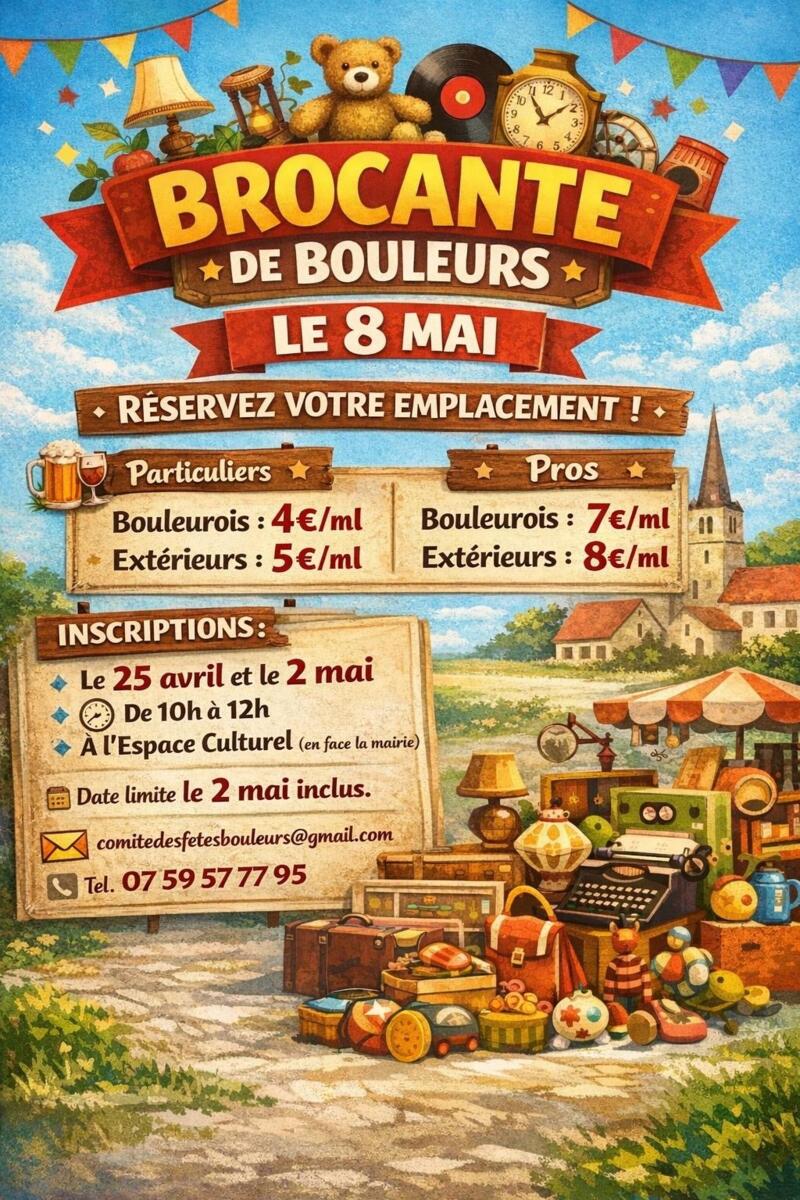 Le vide grenier de Bouleurs se fera le 8 mai 2026, tous les renseignements sur comitédesfetesbouleurs@gmail.com ou au 0759577795.
