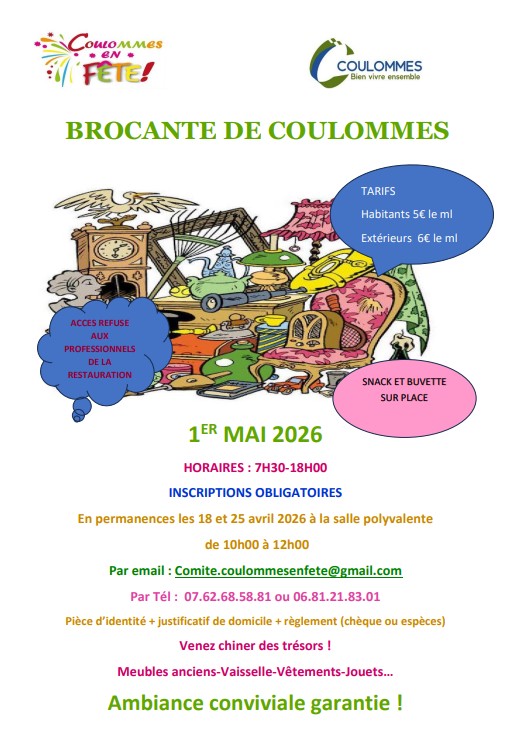 📢 Une brocante à Coulommes le 1er Mai 2026 27/03/2026 Les réservations commencent le 18 avril en salle polyvalente.