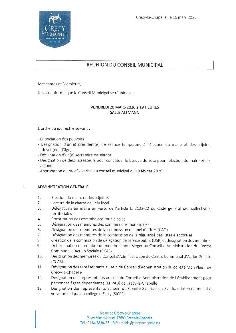 Conseil Municipal D'installation 19/03/2026 🗓Vendredi 20 mars 2026 ⏰19h00 📍Salle Altmann Consultez l'ordre du jour