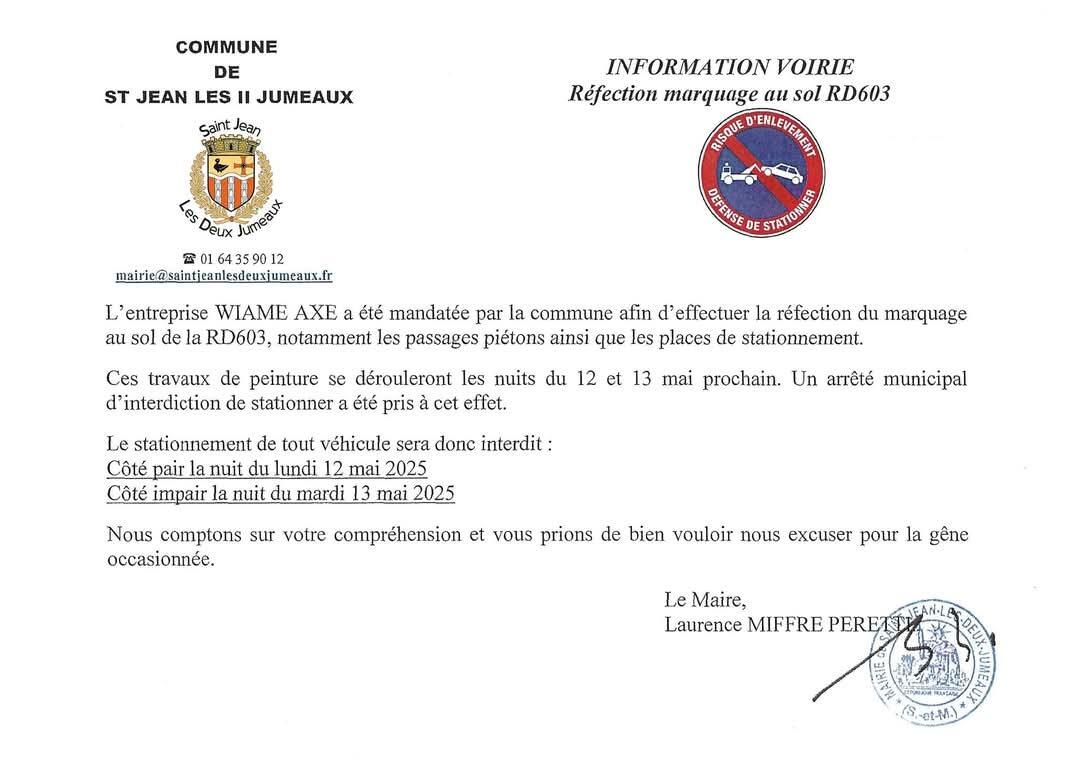 INFORMATION VOIRIE 09/05/2025 REFECTION MARQUAGE AU SOL RD603 Source : Mairie de Saint-Jean-les-deux-Jumeaux