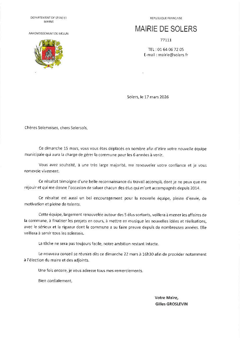 Dans un courrier distribué aujourd'hui dans les boites, Gilles Groslevin, Maire sortant réélu le dimanche 15 mars, remercie les solersoises et solersois.