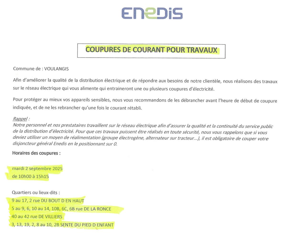 ENEDIS effectuera des coupures de courant le mardi 2 septembre entre 10h et 15h15 dans certains quartiers de la commune.