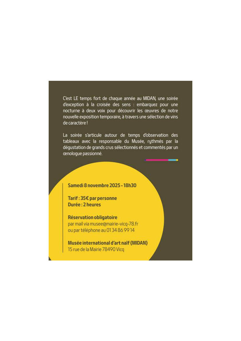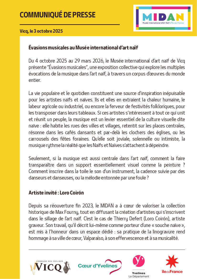 Actualités Midam Vicq 30/10/2025 Nouvelle exposition, "Évasions musicales", sur le thème de la musique dans l'art naïf. Prochain événement au Musée : "1 vin, 1 œuvre" le samedi 8 novembre de 18h30 à 20h30.