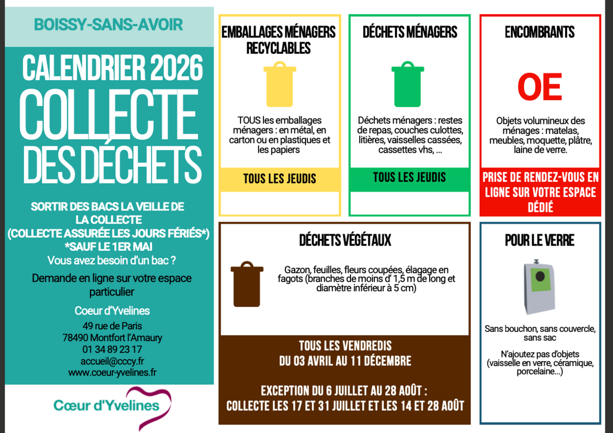 Vous pouvez également accéder au calendrier ci-dessous, ainsi qu’à l'ensemble des informations actualisées concernant les déchèteries et les collectes de déchets, sur le site internet de Cœur d'Yvelines dans la rubrique « Environnement ».