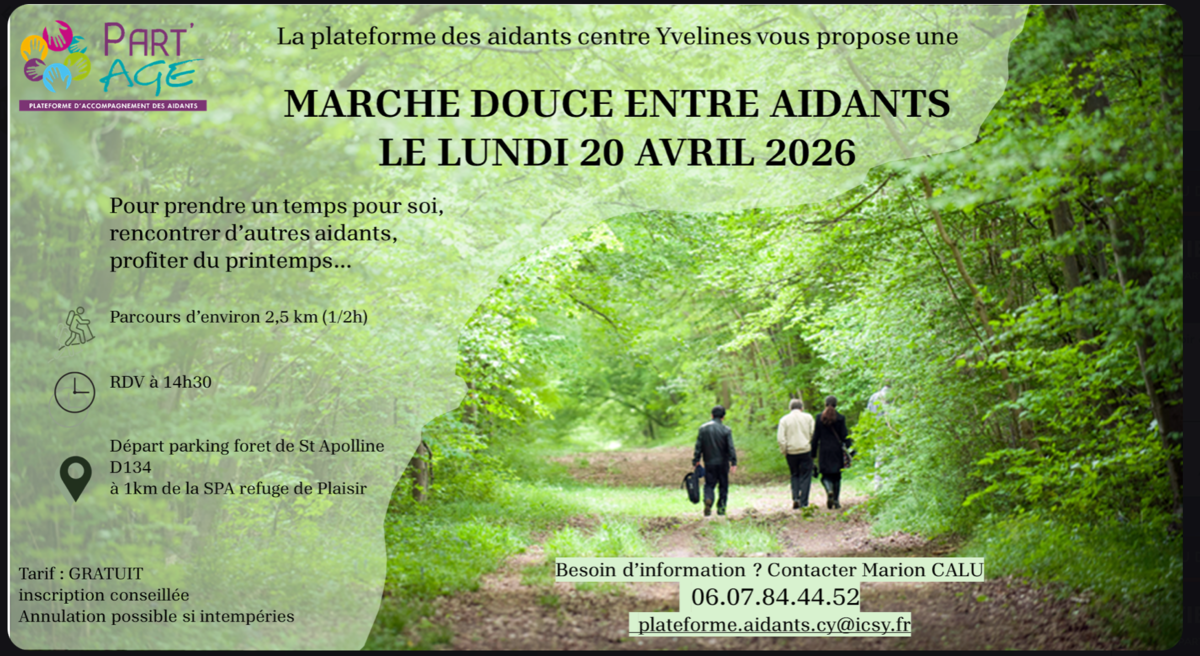 Plateforme Des Aidants Centre Yvelines 13/04/2026 La Plateforme des Aidants Centre Yvelines lance sa toute première activité à destination des aidants du territoire. Il s’agit d’une marche douce entre aidants, pensée comme un moment convivial d’échange, de détente et de soutien mutuel.
