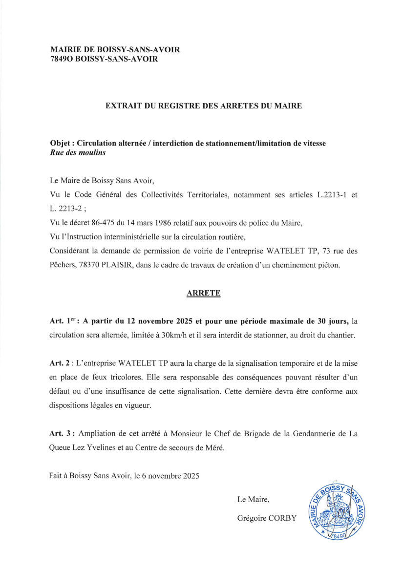 Travaux Rue Des Moulins 11/11/2025 Les travaux de création du cheminement piéton rue des moulins démarrent mercredi 12 novembre. Sur une période de 30 jours, circulation alternée et limitée à 30 km/h, interdiction de stationner, au droit du chantier.