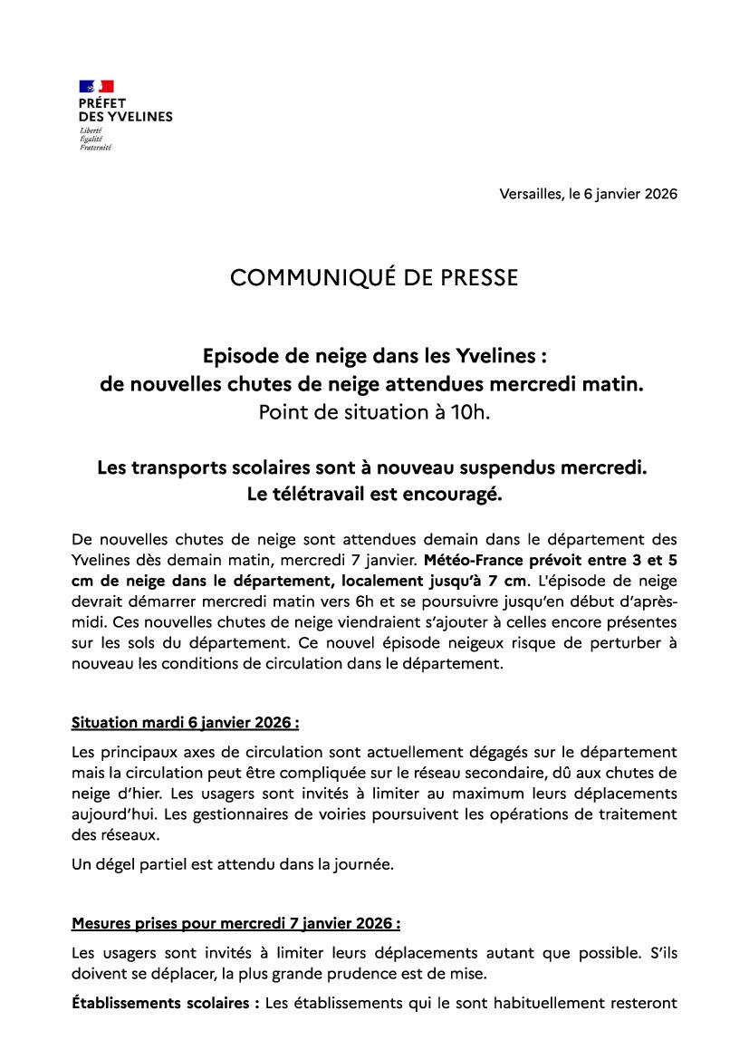 À titre préventif, le préfet des Yvelines encourage, dans la mesure du possible, les employeurs publics et privés à privilégier le télétravail mercredi 7 janvier, afin de limiter les déplacements et de fluidifier la circulation.