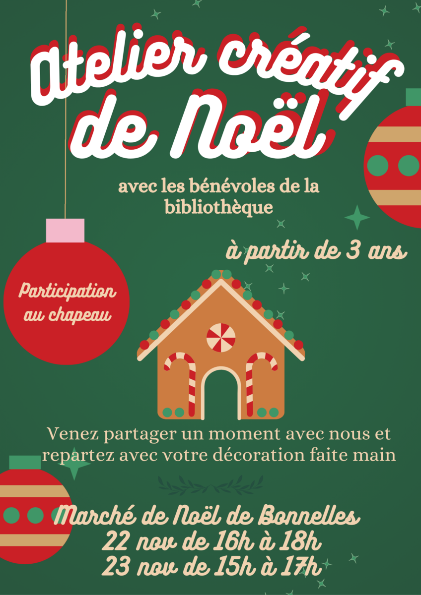 La bibliothèque propose des ateliers de Noël ce week end et sera présente également au marché de Noël aux horaires indiqués sur l affiche (attention ce ne sont pas les horaires du marché de Noël)