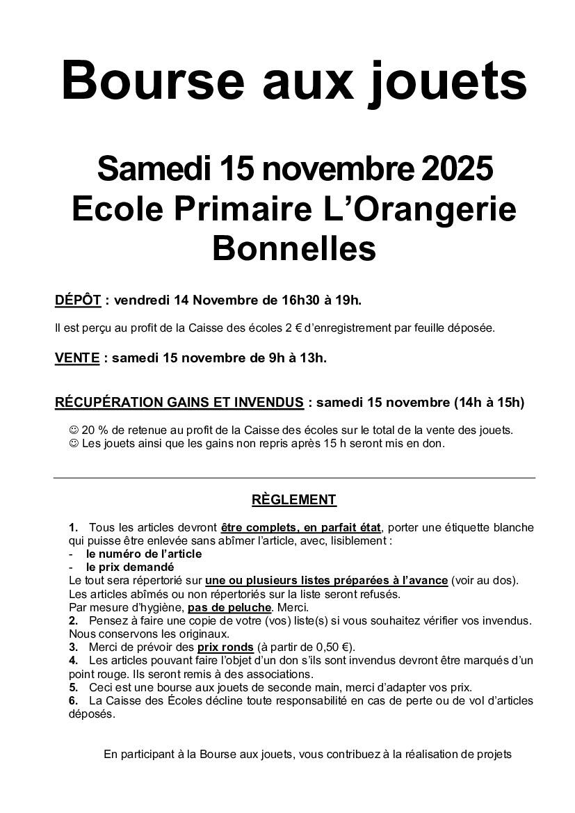 La Caisse Des Ecoles organise une bourse aux jouets dans le hall de l'école élémentaire samedi 15 Novembre 2025.