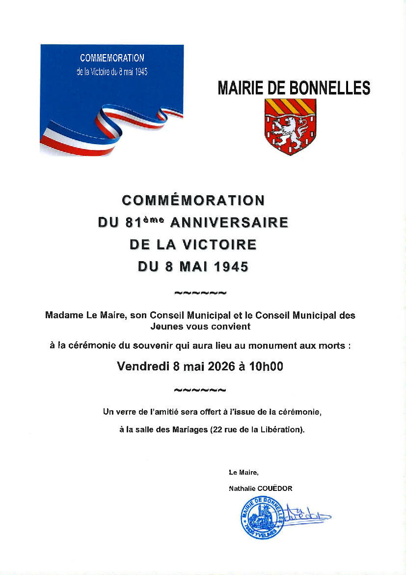 Nous vous convions à participer à la cérémonie du souvenir commémorant le 81ème anniversaire de la victoire du 8 mai 1945 qui se déroulera au monument aux morts à 10h.