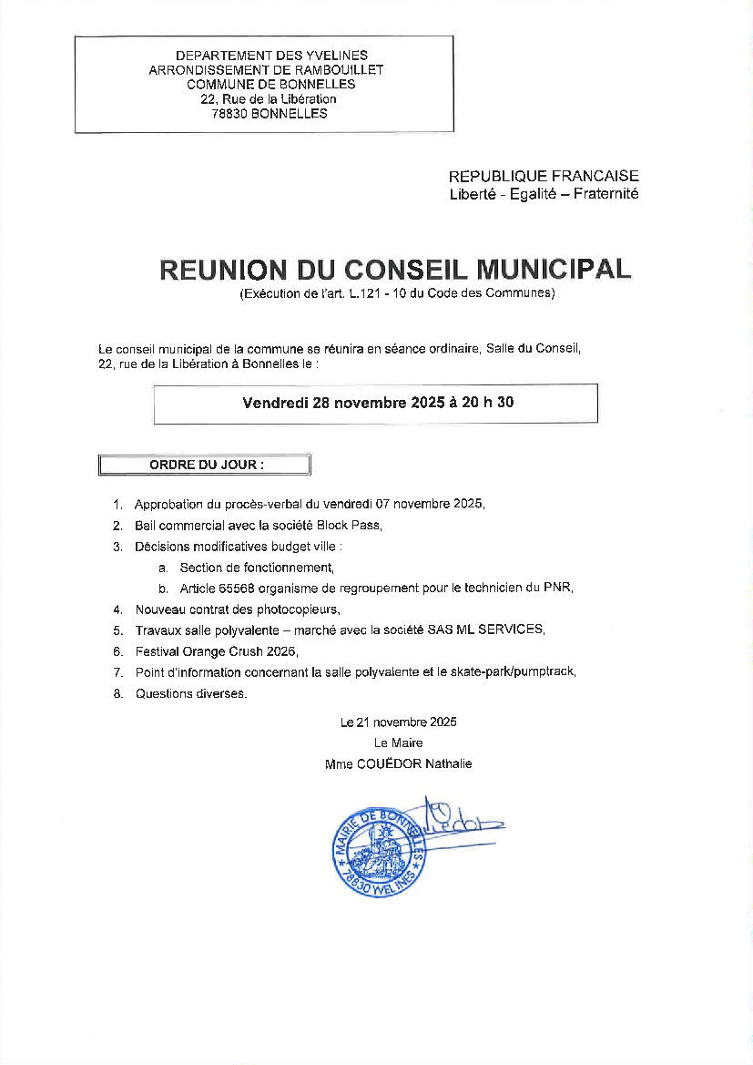 Veuillez trouver ci-joint l'ordre du jour du prochain conseil municipal qui se tiendra le vendredi 28 novembre à 20h30.