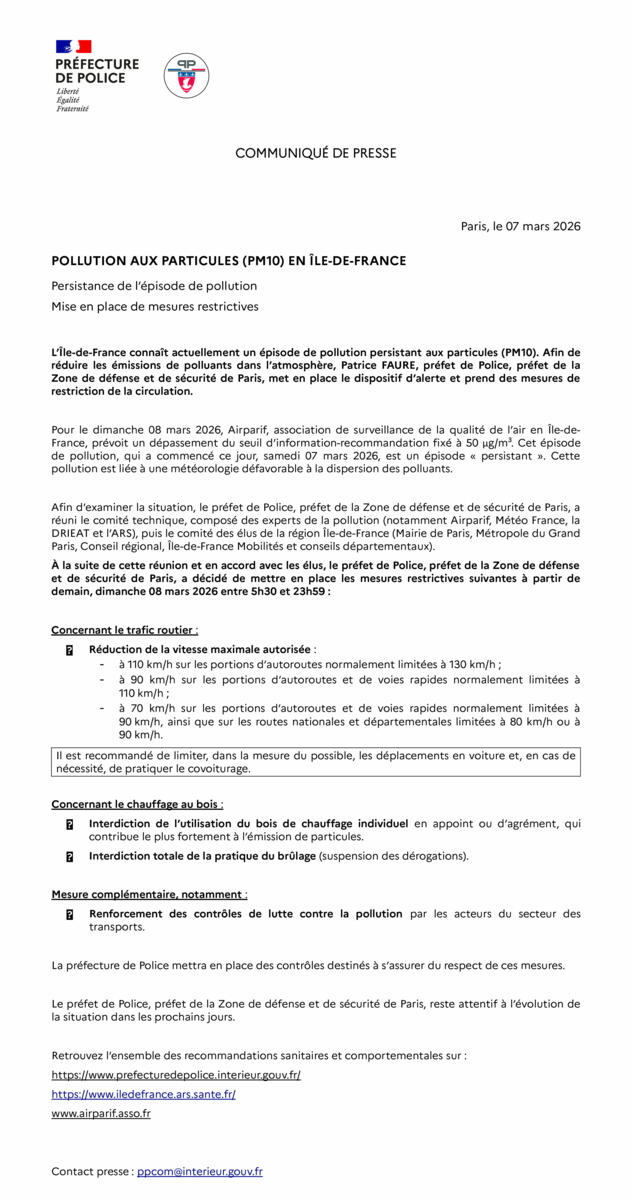 Pollution Aux Particules (Pm10) En Île-De-France 07/03/2026 Message de la Préfecture des Yvelines POLLUTION AUX PARTICULES (PM10) EN ÎLE-DE-FRANCE Persistance de l’épisode de pollution Mise en place de mesures restrictives