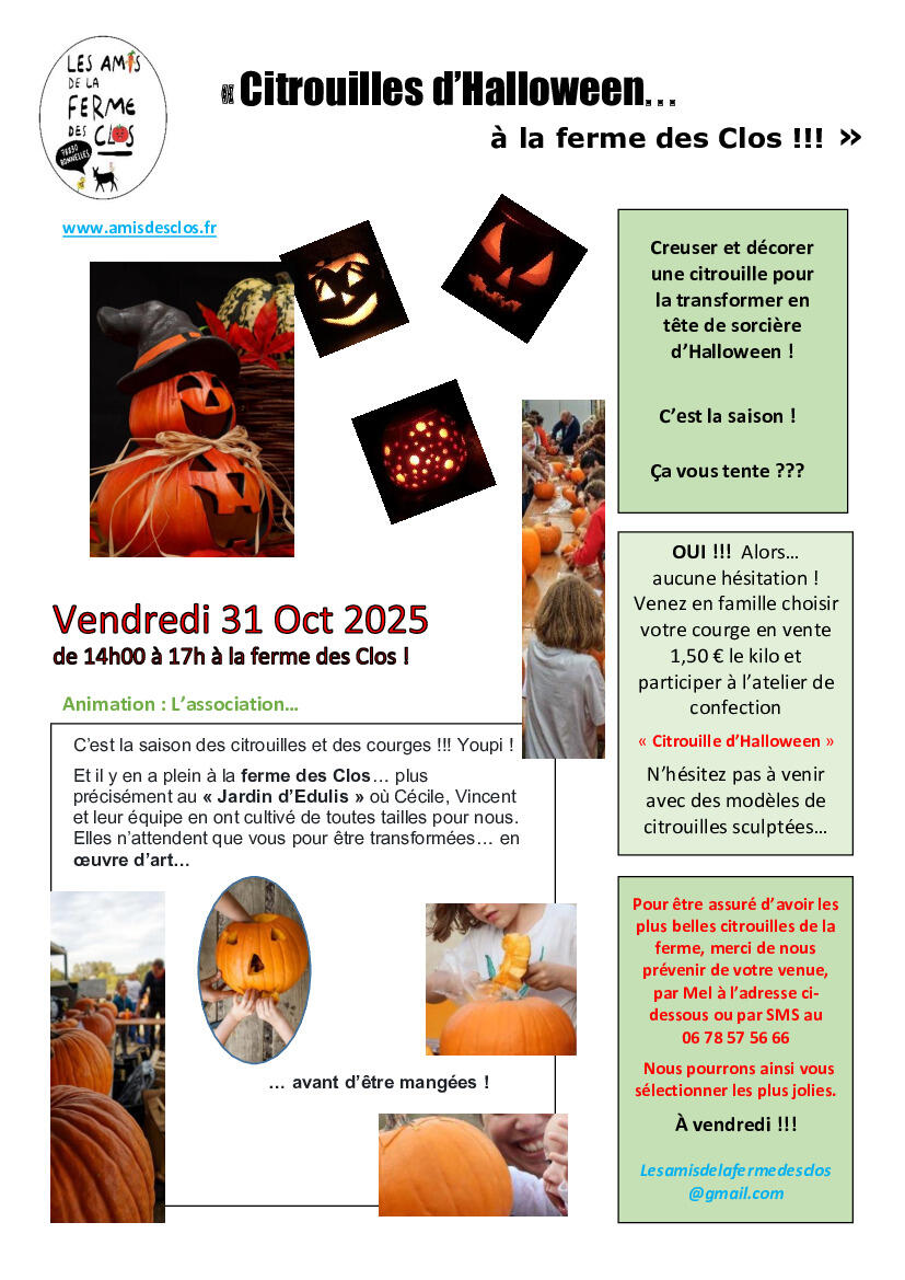 Aussi les « Amis de la ferme des Clos » vous attendent pour participer à un atelier « Citrouilles » Vendredi 31 octobre à partir de 14h00 jusqu’à 17h ou épuisement du stock… à la ferme des Clos… bien sûr !