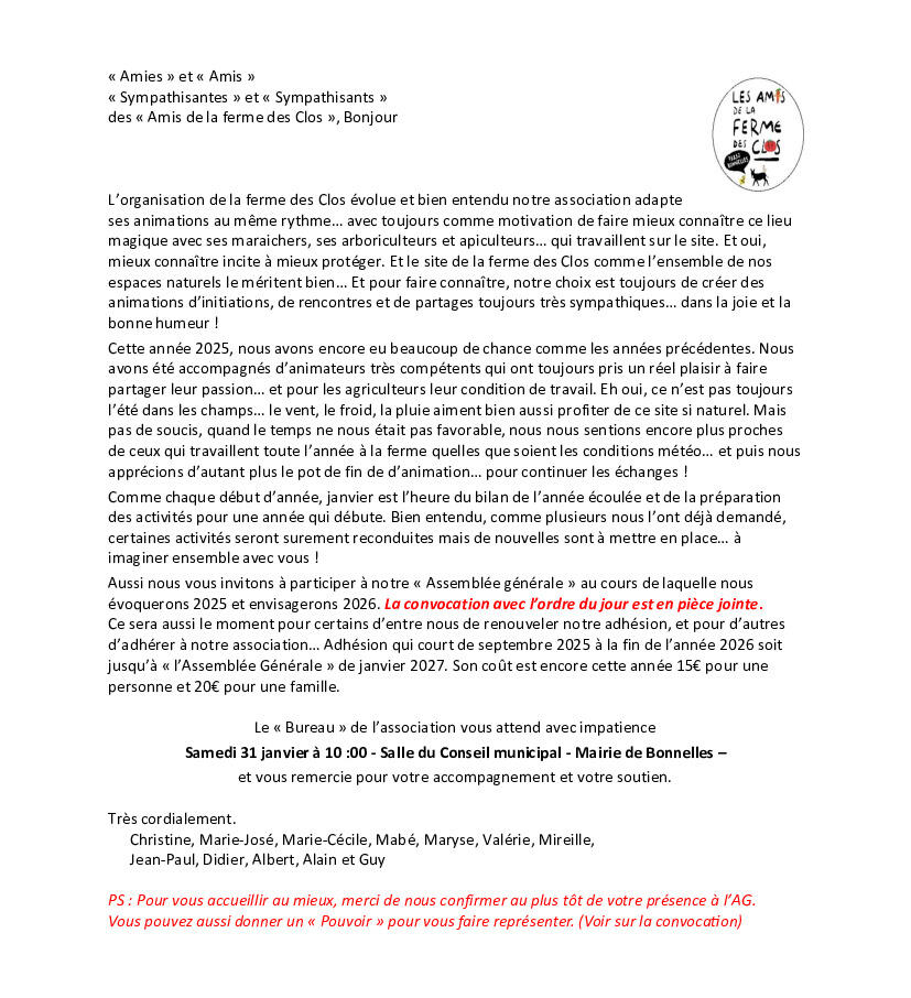 Les amis de la ferme des Clos 29/01/2026 Vous convient à leur assemblée générale Source : Mairie de Bonnelles