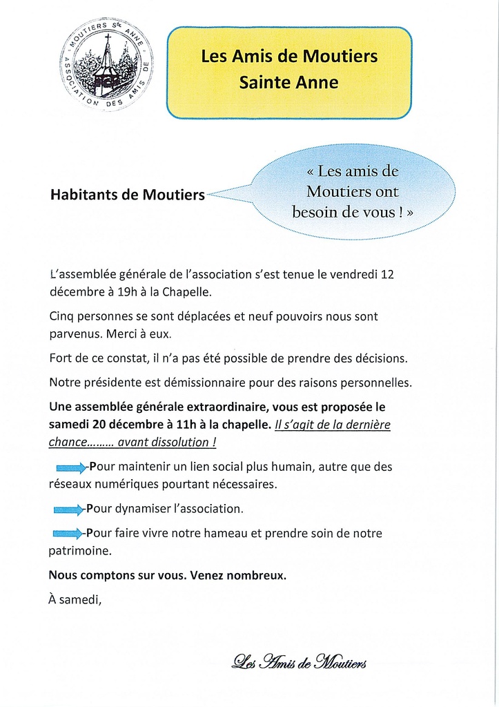 Les Amis de Moutiers organise une assemblée générale extraordinaire le samedi 20 décembre 2025 à 11h à la Chapelle Sainte-Anne.