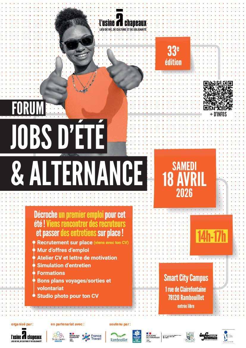 Le Bureau Info Jeunes de l’Usine à Chapeaux, en partenariat avec la Mission Locale Intercommunale de Rambouillet et France Travail, organise le Forum Jobs d’été & Alternance :