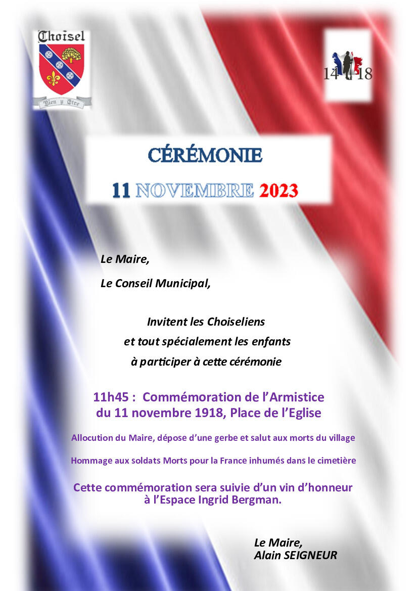 Le Maire et le Conseil Municipal invitent les Choiseliens, et tout spécialement les enfants, à participer à la cérémonie commémorative de l’Armistice de 1918.