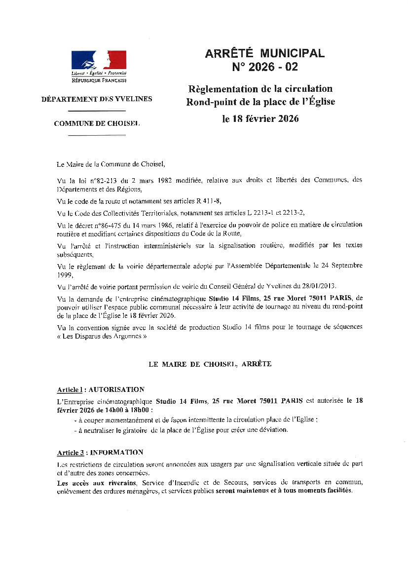 L'Entreprise cinématographique Studio 14 Films, est autorisée le 18 février 2026 de 14h00 à 18h00 à couper momentanément et de façon intermittente la circulation place de l'Église et à neutraliser le giratoire de la place de l'Église pour créer une déviation.