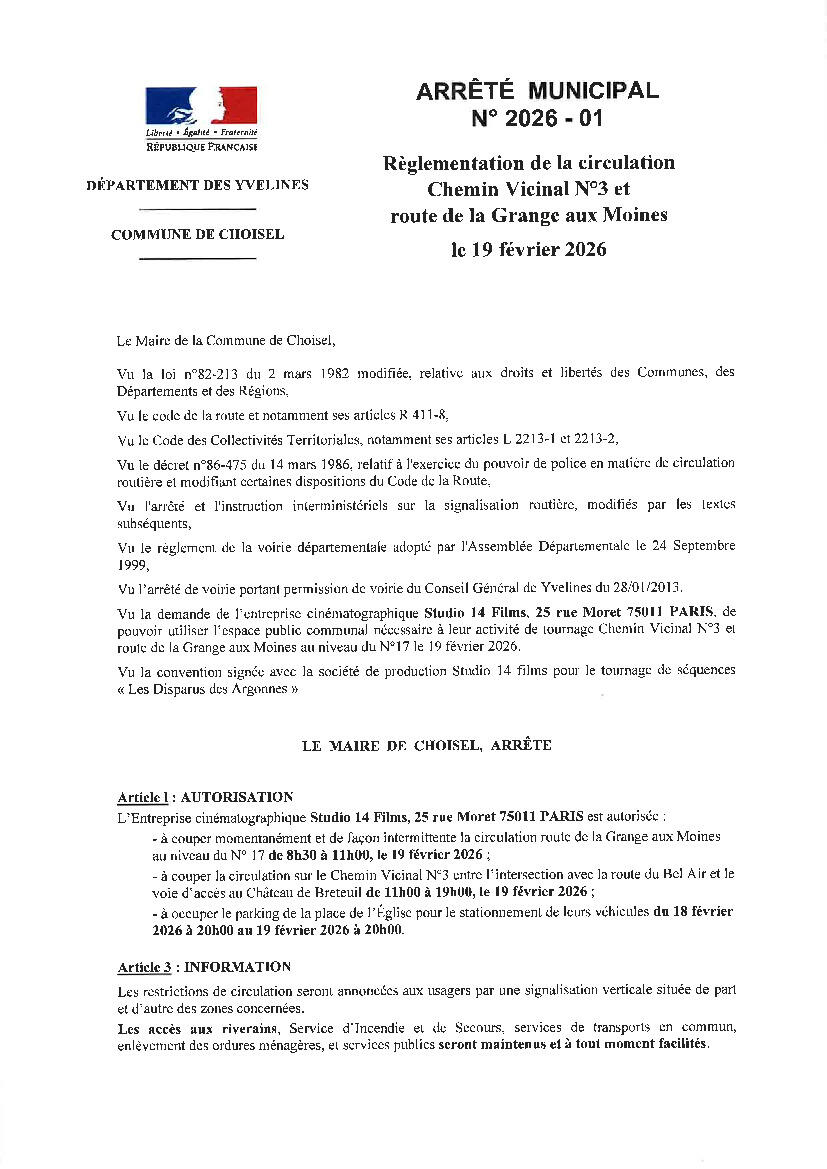 L'Entreprise cinématographique Studio 14 Films, est autorisée aujourd'hui de 11h00 à 19h00 à couper la circulation sur le Chemin Vicinal n°3 (entre l'intersection route de la Grange aux Moines avec la route du Bel-Air, et la voie d'accès au Château de Breteuil), et à occuper le parking de la place de l'Église pour le stationnement de leurs véhicules jusqu'au 19 février 2026 à 20h00.