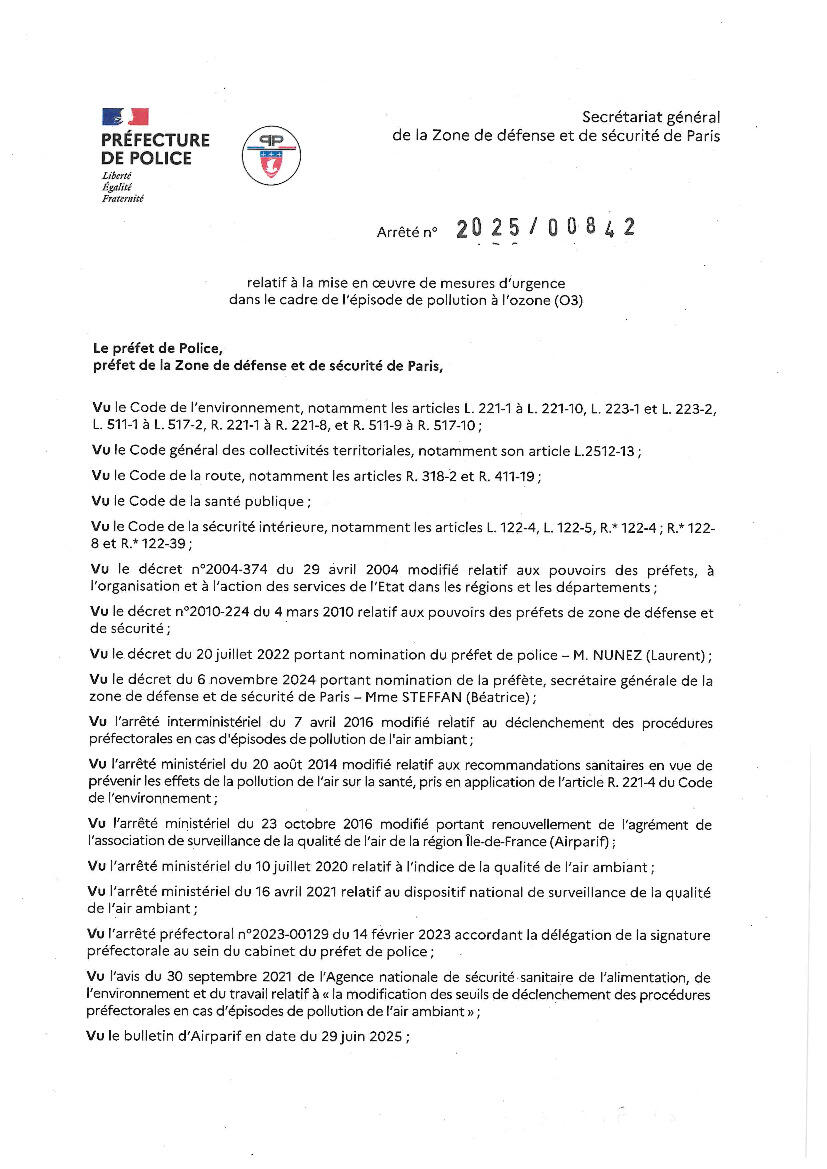 En raison d'un épisode de pollution à l'ozone en région Île-de-France, le Préfet de la zone de défense et de sécurité de Paris a décidé de prendre des mesures adaptées permettant de réduire les émissions de polluants dans l'atmosphère et d'en limiter les effets sur la santé humaine et l'environnement.