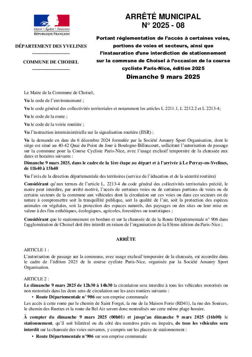 À compter du dimanche 9 mars 2025 (00h01) et jusqu’au dimanche 9 mars 2025 (16h00) le stationnement, qu’il soit bilatéral ou du côté des numéros pairs ou impairs, de tous les véhicules sera interdit sur la Route Départementale n°906 (sur son emprise communale et y compris sur les places de stationnement).