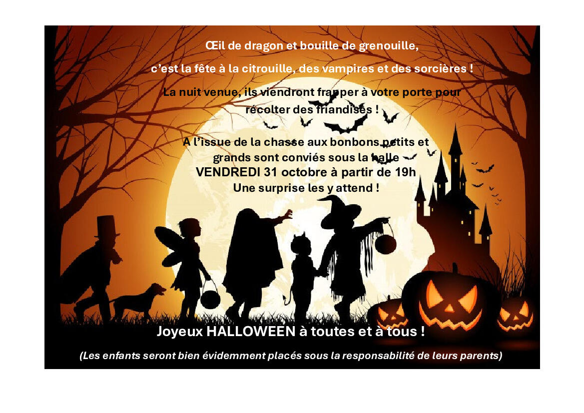 👻A l’issue de la chasse aux bonbons petits et grands sont invités sous la halle à partir de 19h 👻