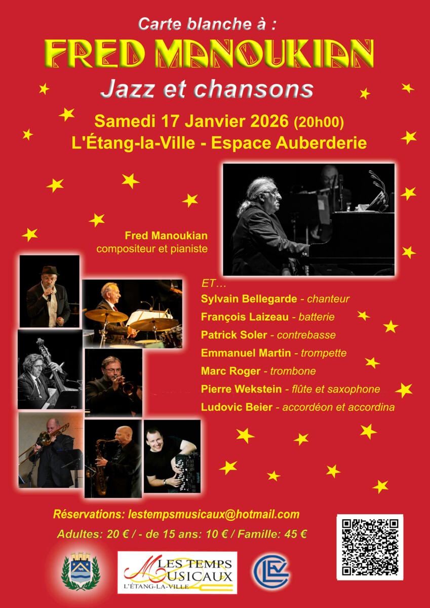 ⥠Vous pouvez réserver vos places dÚs maintenant par mail à  lestempsmusicaux@hotmail.com ou en cliquant sur ce lien direct : https://www.helloasso.com/associations/club-de-loisirs-de-l-etang-la-ville/evenements/tm-fred-manoukian-jazz-et-chansons