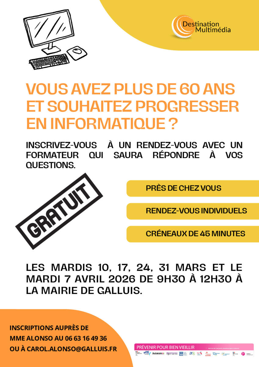 Le CCAS, via Destination Multimédia, propose des cours individuels gratuits pour vous accompagner dans l'utilisation de vos ordinateurs, tablettes ou smartphones. Il reste 4 créneaux disponibles :