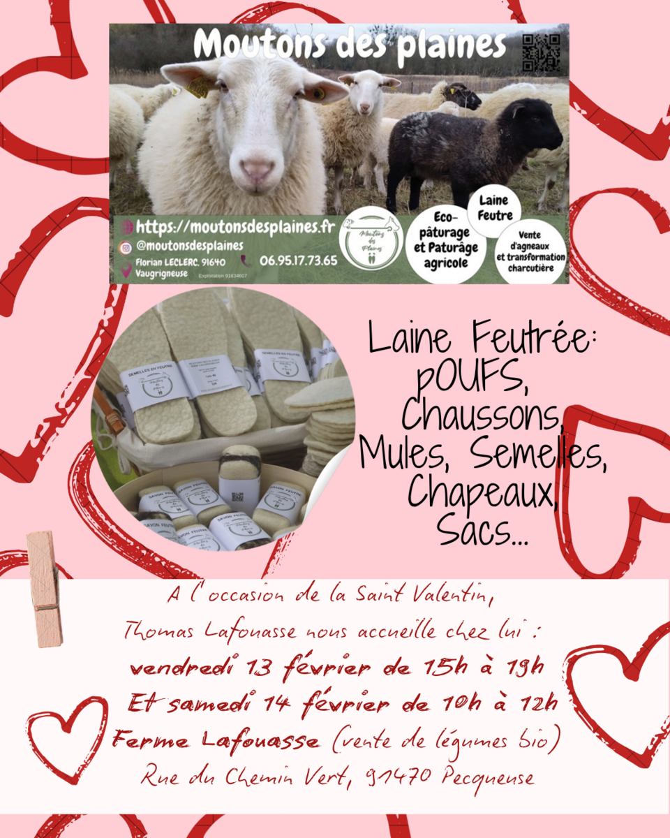À l’approche de la Saint Valentin, Moutons des Plaines est heureux de vous inviter à découvrir ou redécouvrir sa gamme artisanale de produits en laine feutrée : poufs, chapeaux, sacs, chaussons, savons feutrés et bien plus encore, tous confectionnés à partir de la laine de ses brebis élevées en plein air.