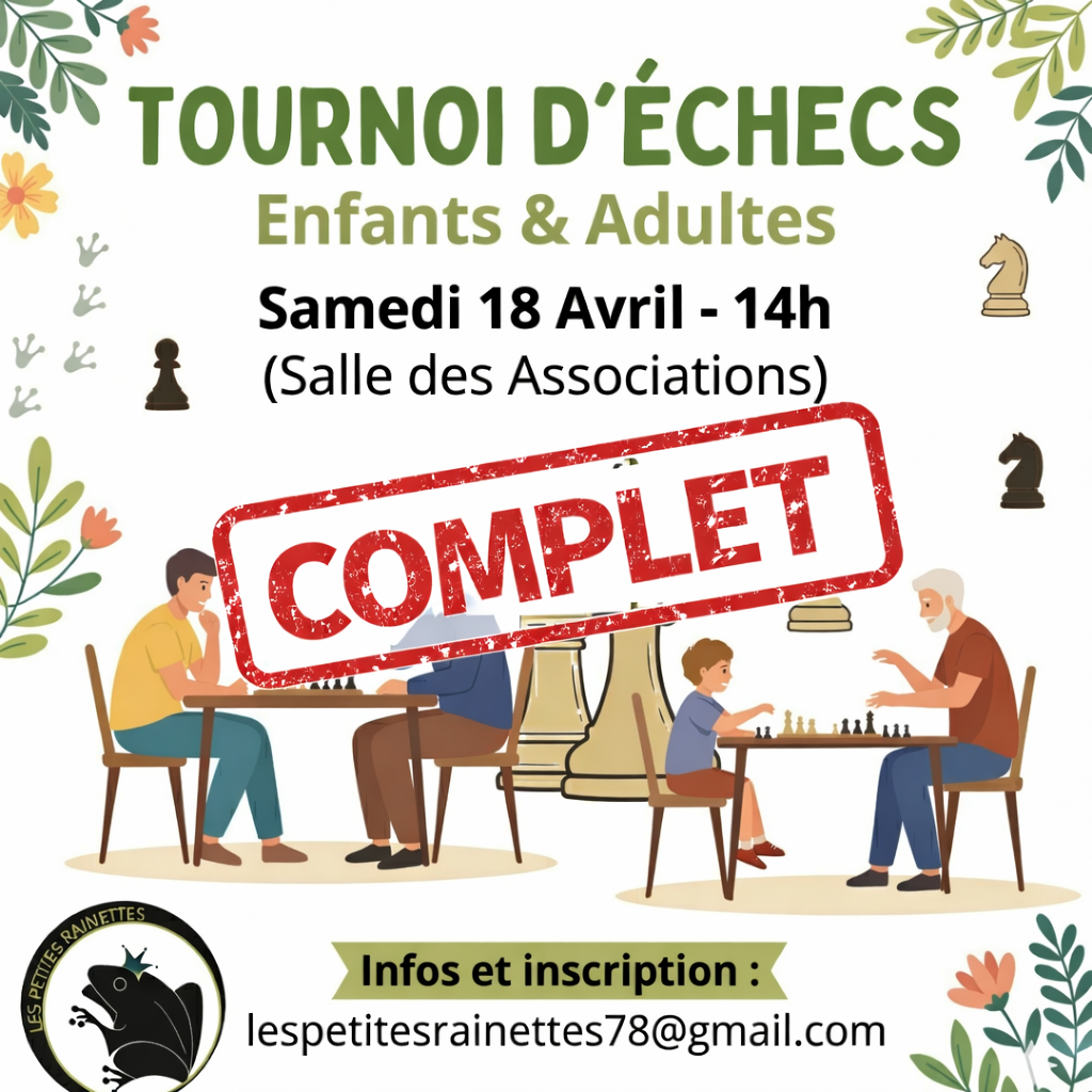 Tournoi D'échec Hermeray Samedi 18 Avril - Complet 16/04/2026 Le Tournoi d'echecs Enfants et Adultes du Samedi 18 Avril est COMPLET
