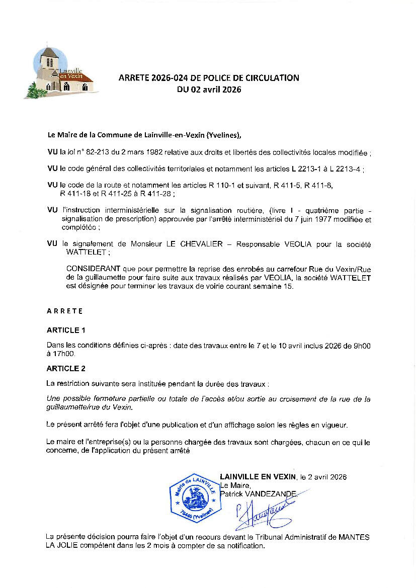 Arrêté RUE DU VEXIN/RUE DE LA GUILLAUMETTE