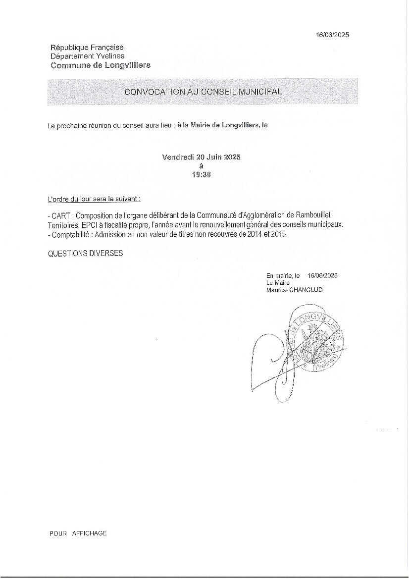 Conseil Municipal - vendredi 20 juin 2025 17/06/2025 Bonjour à toutes et à tous, Source : Mairie de Longvilliers