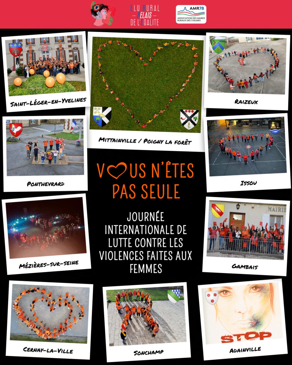 A l’occasion de la Journée Internationale pour l’élimination de la violence à l’égard des femmes de lundi prochain,, l'Association des Maires Ruraux des Yvelines (AMR 78) a décidé de publier sur ses réseaux sociaux un pêle-mêle de toutes les photos prises par certains d'entre vous où, élu(e)s, agent(e)s et habitant(e)s, toutes et tous habillés avec un accessoire de couleur orange (t-shirt, foulard, écharpe...), forment une chaîne humaine.