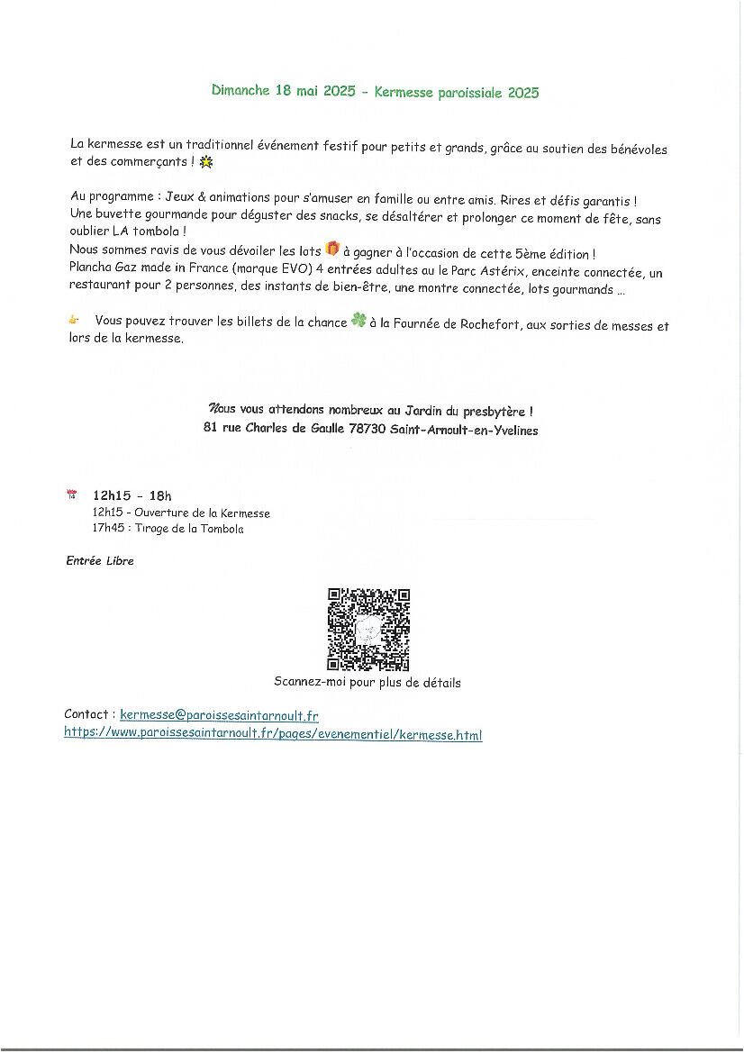 Kermesse paroissiale dimanche 18 mai 2025 16/05/2025 Kermesse dans le jardin du presbytère au 81, rue Charles de Gaulle à Saint Arnoult en Yvelines.