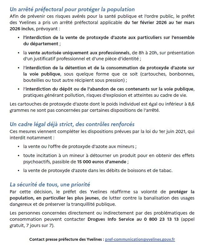 Face à la recrudescence préoccupante de l’usage détourné du protoxyde d’azote dans le département des Yvelines, M. le préfet des Yvelines a décidé de renforcer les mesures de prévention et de protection de la population par la prise d’un arrêté préfectoral encadrant strictement la vente, la détention et la consommation de ce produit.