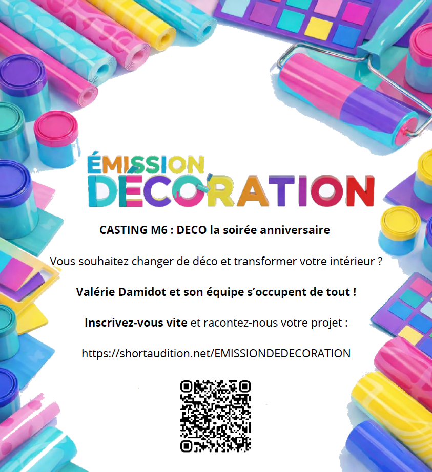 CASTING M6 : DECO la soirée anniversaire Valérie Damidot revient maroufler nos écrans pour fêter 20 ans de déco sur M6 au cours d’une soirée anniversaire exceptionnelle ! Vous avez envie de changer de déco ? Que ce soit pour vous ou un proche, que vous soyez en appartement ou en maison, locataire ou propriétaire… Valérie et son équipe sont là pour vous aider à transformer votre intérieur et changer votre quotidien. Inscrivez-vous vite et racontez-nous votre projet : https://shortaudition.net/EMISSIONDEDECORATION