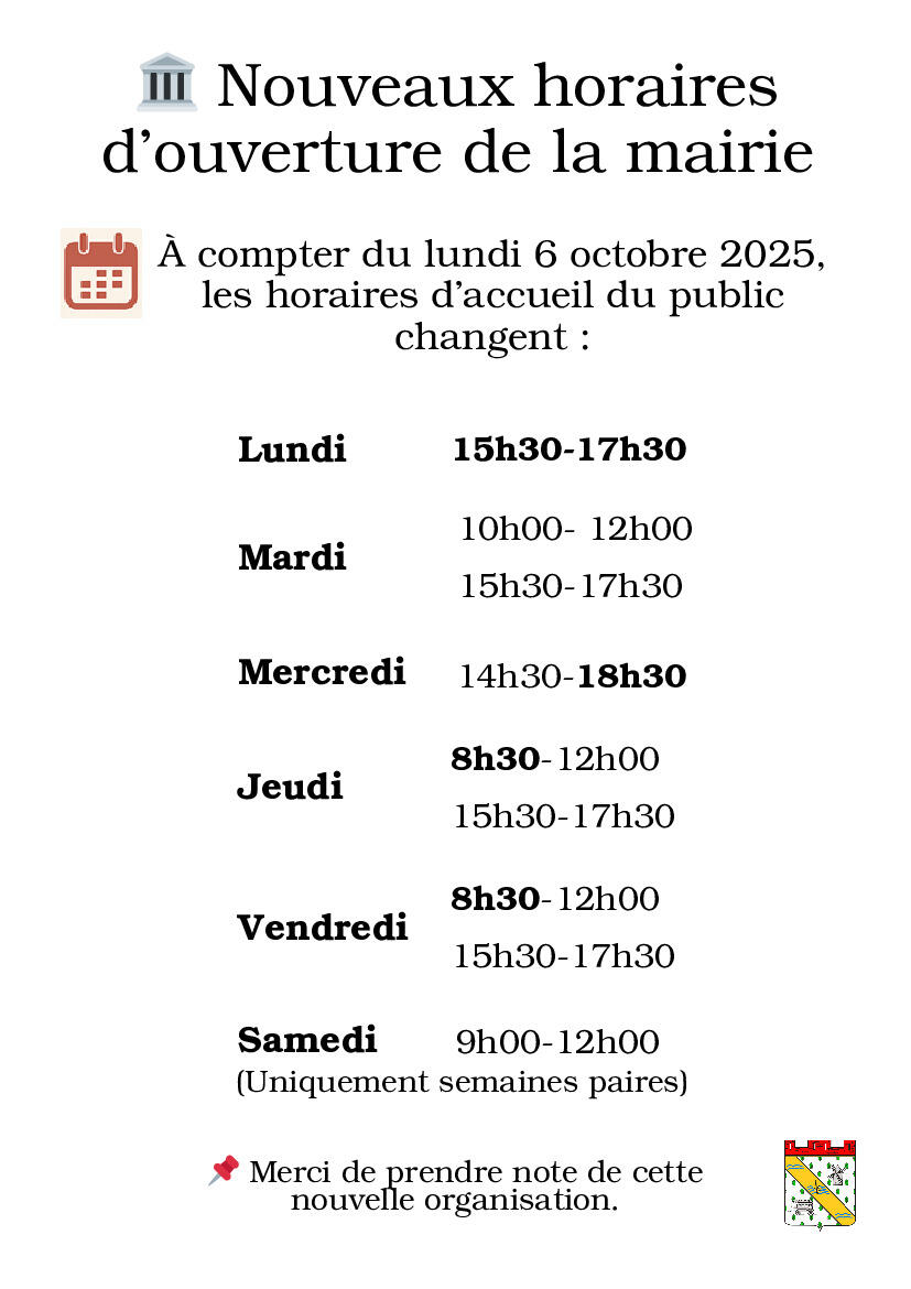 Votre mairie / Actualités / Nouveaux horaires d'ouverture de la Mairie