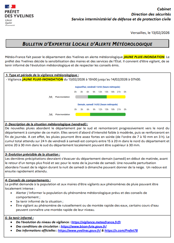 A compter de ce jour le département des Yvelines est placé en vigilance JAUNE "Pluie inondation" de 15h00 à 07h00 demain matin.