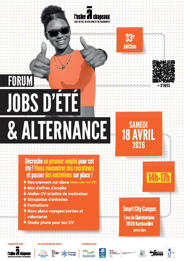Le Bureau Info Jeunes de l’Usine à Chapeaux, en partenariat avec la Mission Locale Intercommunale de Rambouillet et France Travail, organise le Forum Jobs d’été & Alternance :