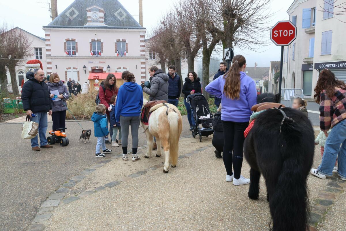 Sur le parvis de l'hôtel de ville, faute de rennes, les poneys des Écuries de Saint-Arnoult emmènent les enfants sur leur dos pour une promenade.