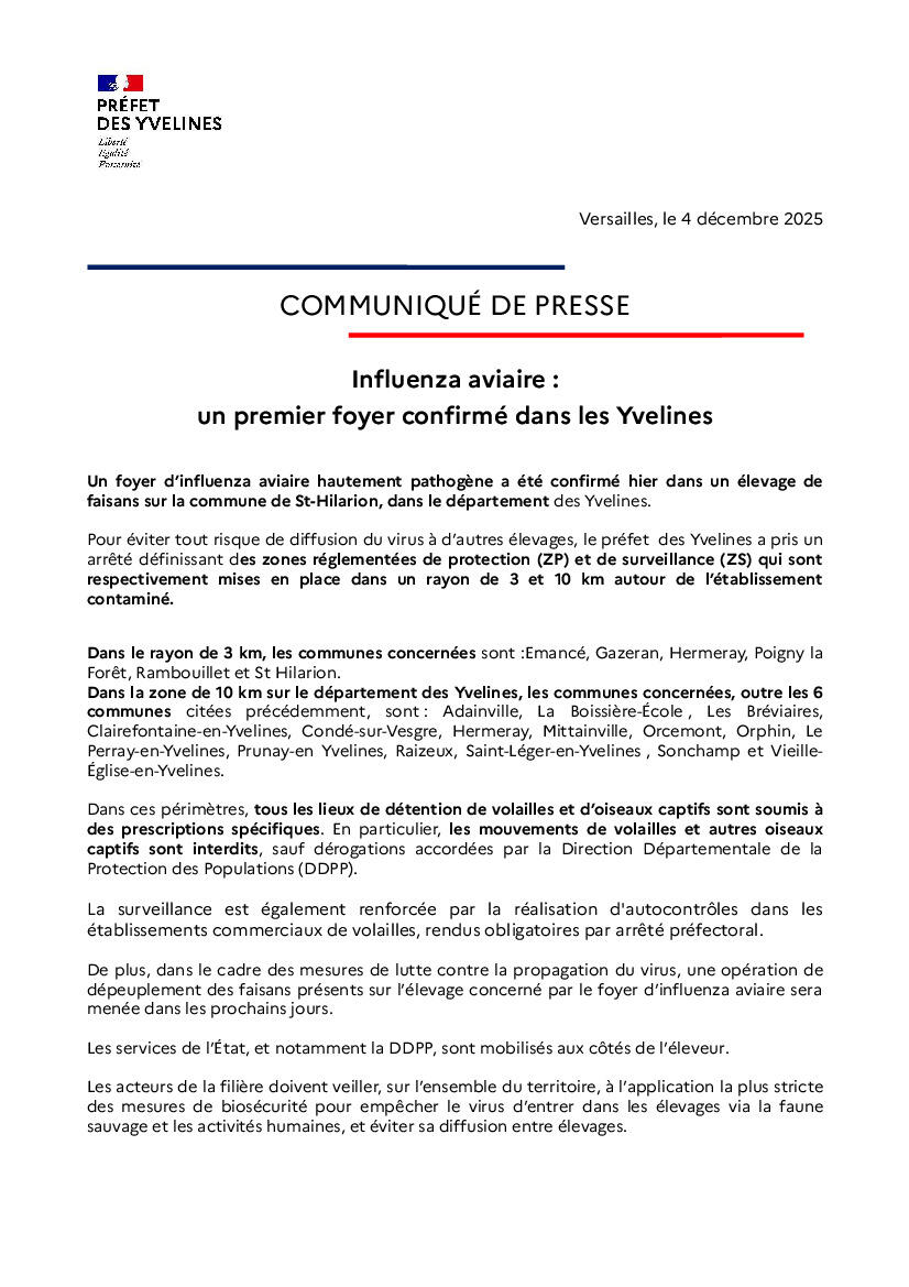 Nous avons été alertés par la Préfecture d’un foyer de grippe aviaire.