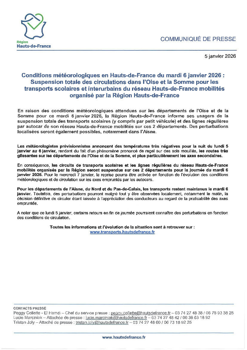 Vu les conditions météorologiques dans les Hauts de France ce mardi 6 janvier 2026 le transport scolaire est suspendu.