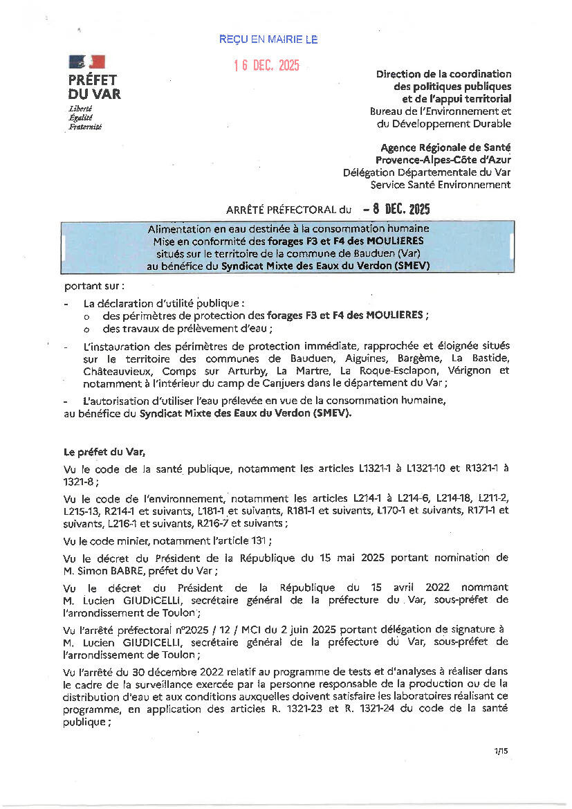 ARRETE PREFECTORAL ALIMENTATION EAU POTABLE FORAGE F3 ET F4