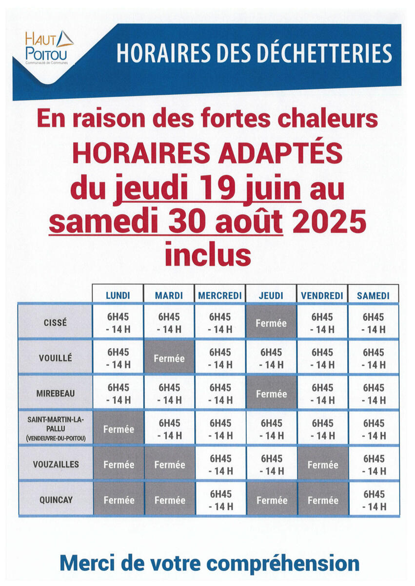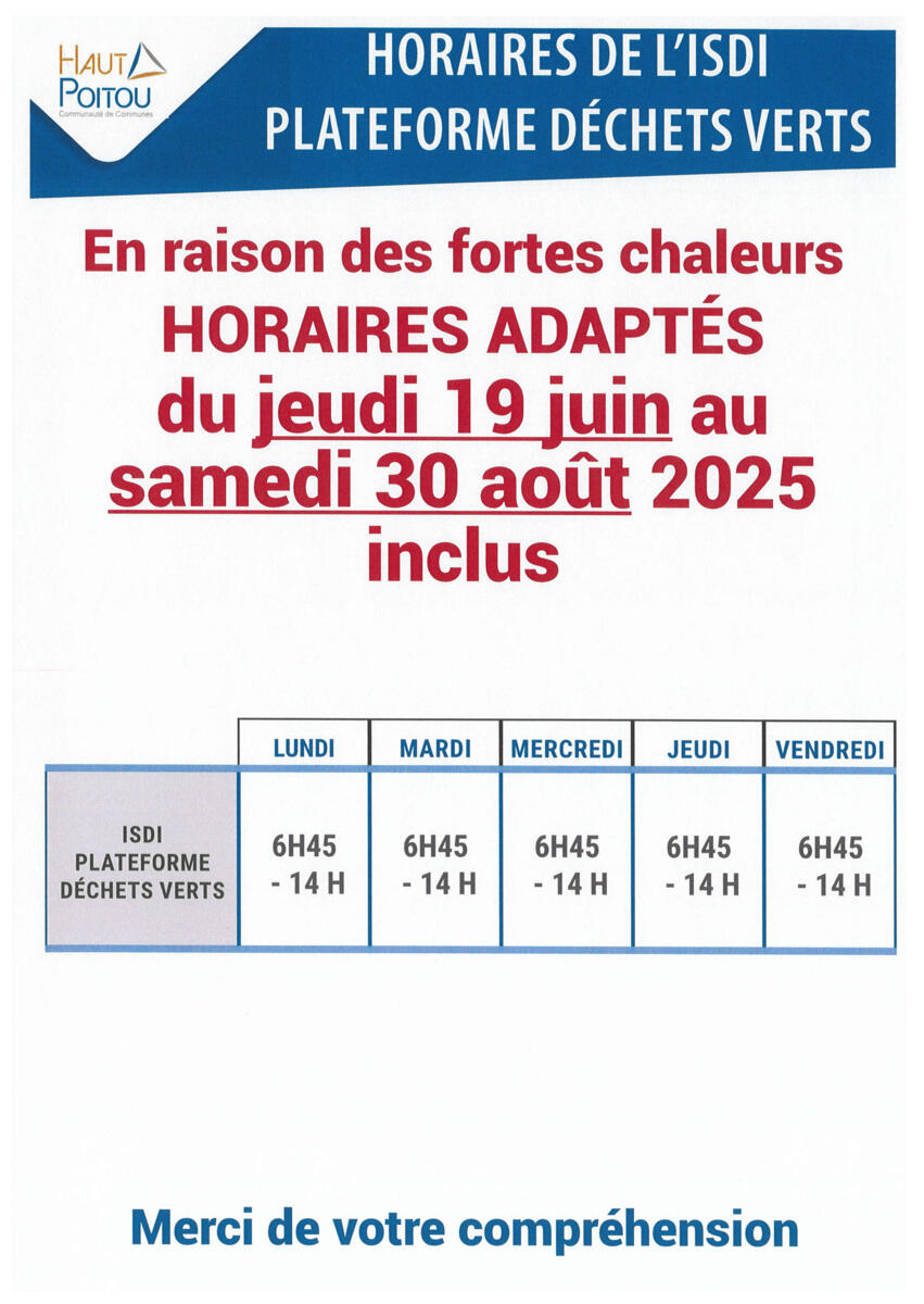 DÉCHETTERIES ET PLATEFORME DÉCHETS VERTS 03/07/2025 HORAIRES ADAPTÉS en raison des fortes chaleurs. Source : Mairie d'Amberre