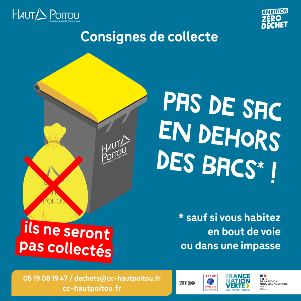 Merci de ne pas poser de sacs en dehors des bacs : ils ne seront pas collectés (sauf sacs jaunes si vous habitez en bout de voie ou dans une impasse)