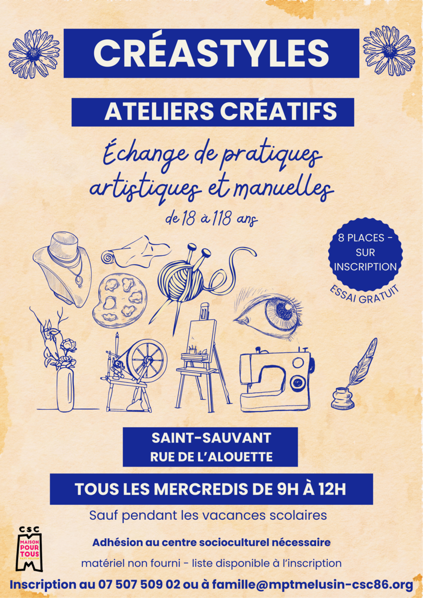 Créastyles à St Sauvant 02/06/2025 Tous les mercredis de 9h à 12h (sauf pendant les vacances scolaires) sur inscription