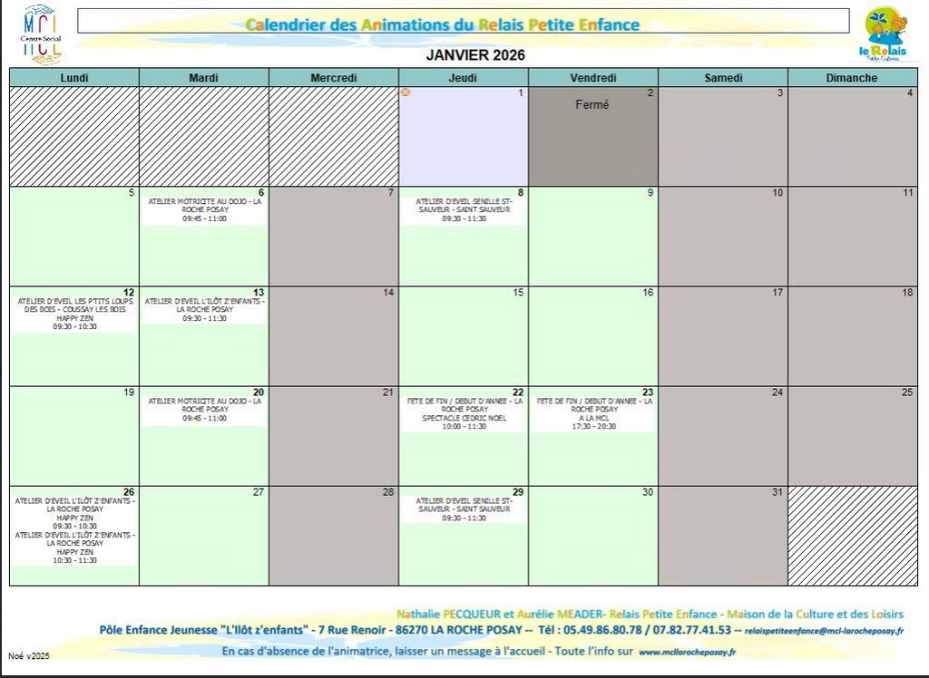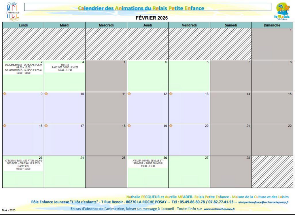 Plannings Relais Petite Enfance MCL Janvier & Février 2026